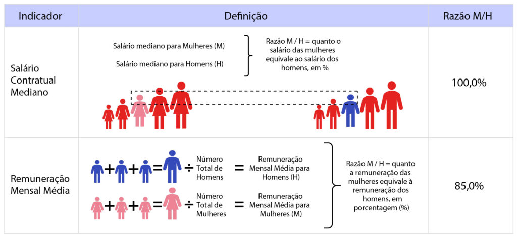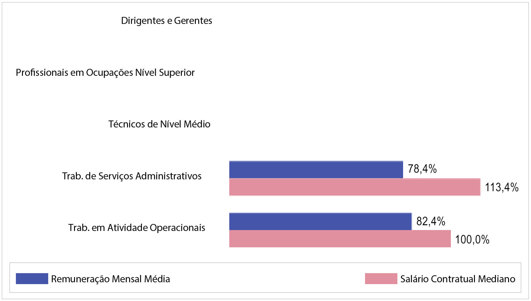 - O salário contratual mediano das mulheres equivale a 100,0% do recebido pelos homens.